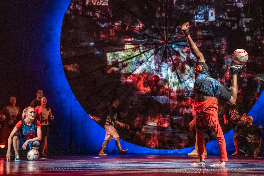 Uno de los aspectos más impactantes del espectáculo es la incorporación de la lluvia como elemento escénico, un logro técnico sin precedentes en una producción itinerante de Cirque du Soleil. A esto se suma una propuesta acrobática que alcanza niveles extraordinarios: desde un contorsionista que lleva el cuerpo humano a límites insospechados, hasta un especialista en aerial straps suspendido sobre un cenote, pasando por saltos vertiginosos sobre cintas mecánicas que multiplican la velocidad y el riesgo. Incluso el fútbol freestyle encuentra su lugar en escena, fusionándose con la danza urbana en un despliegue tan inesperado como fascinante.